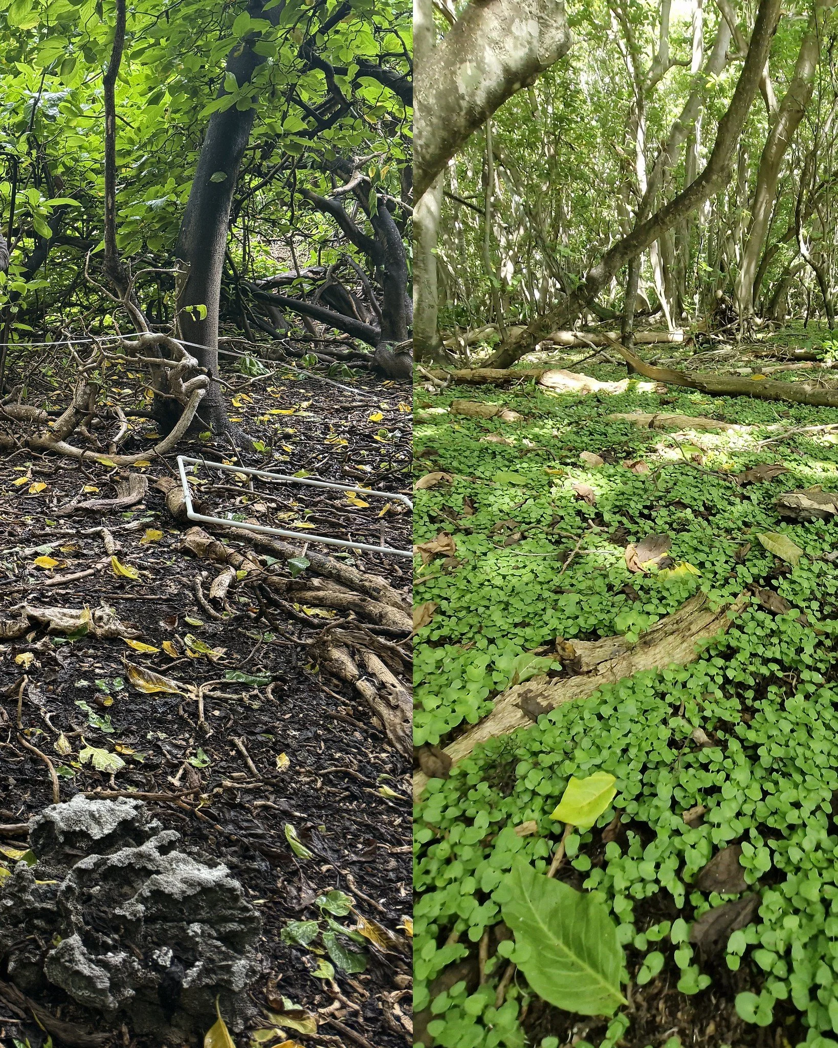 The forest floor in 2024, contrasted with 2025. Native Pisona seedlings rebound one year after restoration! Photo credit: Island Conservation